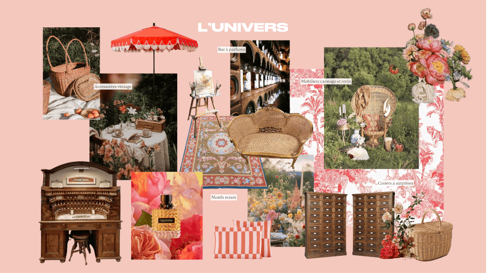 Pour cet événement, nous avons plongé dans un imaginaire délicat : une tea party estivale, un pique-nique chic ou encore un boudoir en plein-air. On a mêlé poésie florale, mobilier vintage et expérience olfactive.