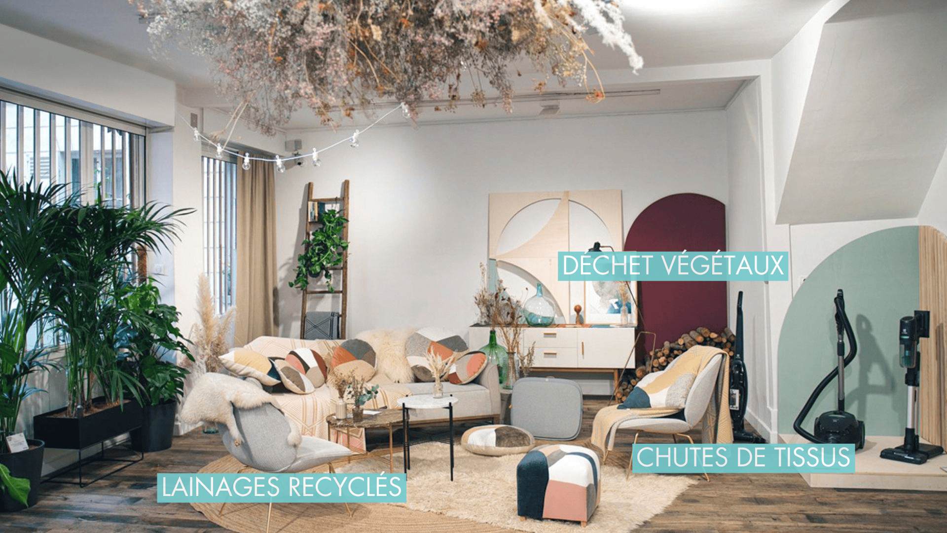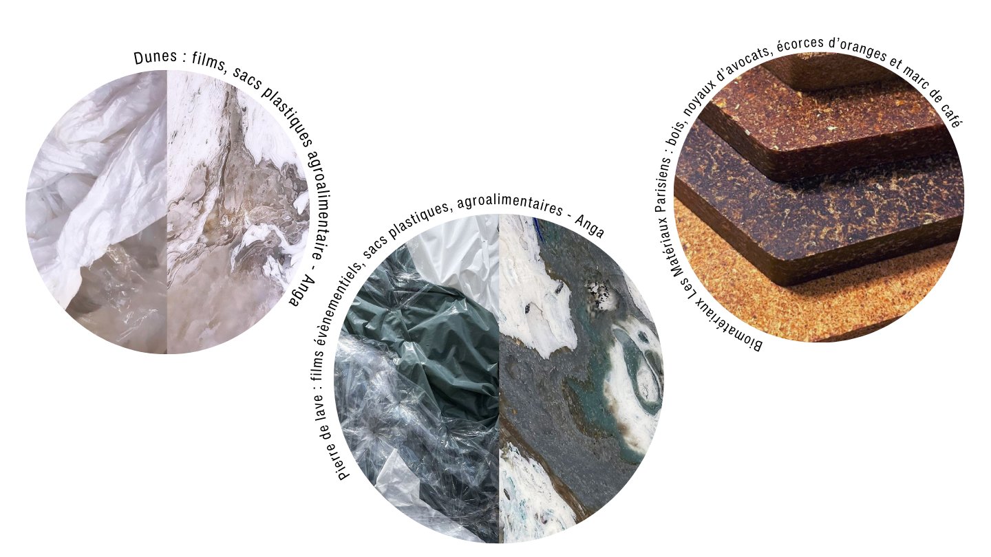 Exemple : Parmi nos partenaires, on compte des ateliers innovants comme Anga qui réalise un marbre à partir de plastique fondu, ou des Matériaux Parisiens qui créent des biomatériaux.