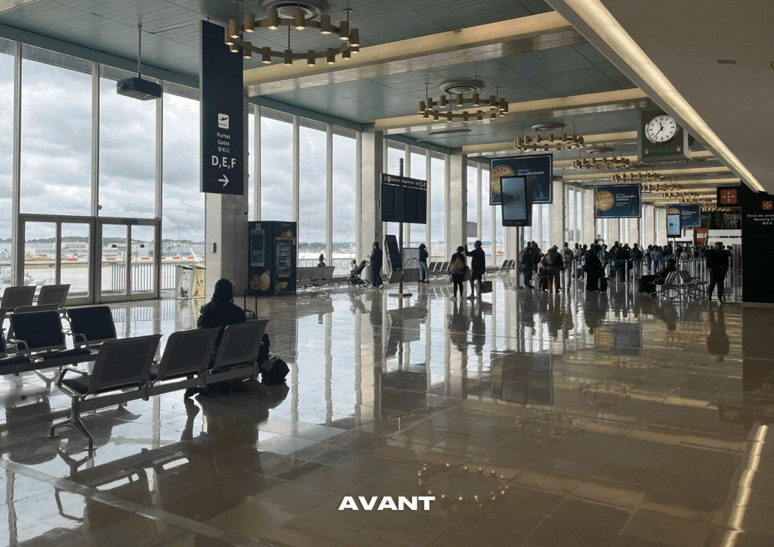 Le montage a débuté à minuit et s’est achevé à dix heures du matin, au cœur du terminal Orly 4. Durant cette nuit de travail, nos équipes ont installé l’ensemble du décor, ajusté les lumières, positionné le mobilier et coordonné les derniers détails avec les équipes du Groupe ADP et d’OVAL. Malgré les contraintes inhérentes à un aéroport, chaque étape a été menée avec précision et fluidité.