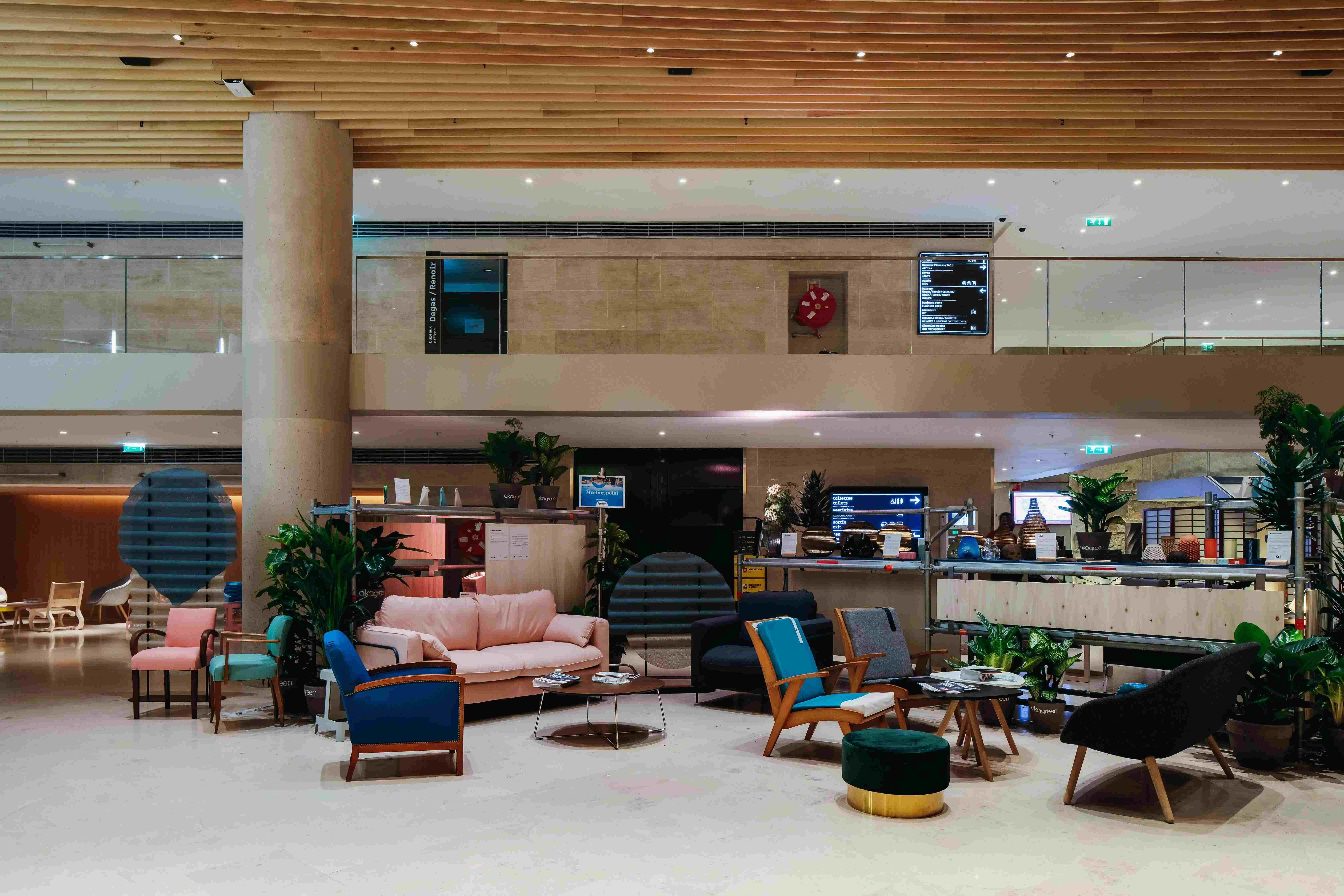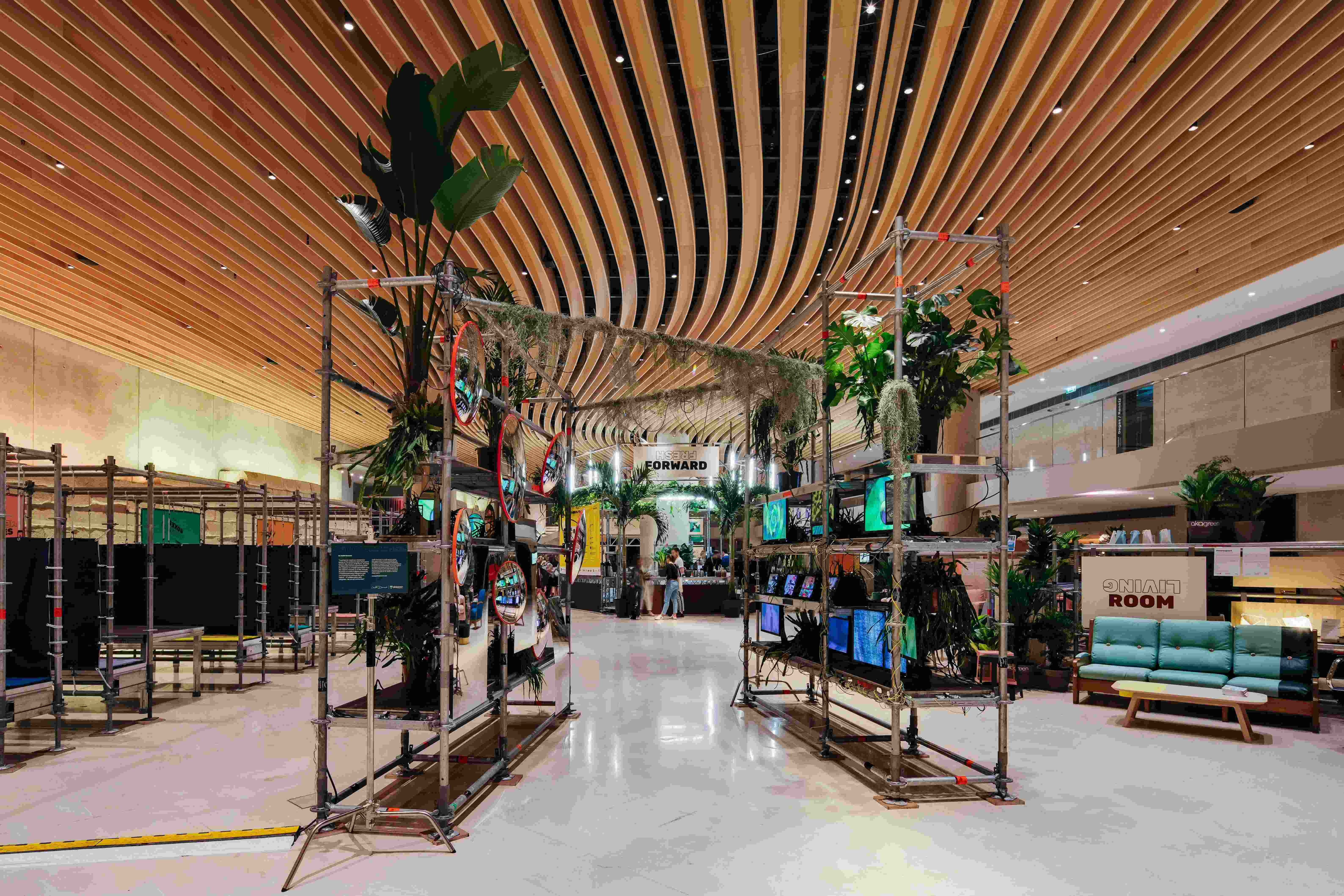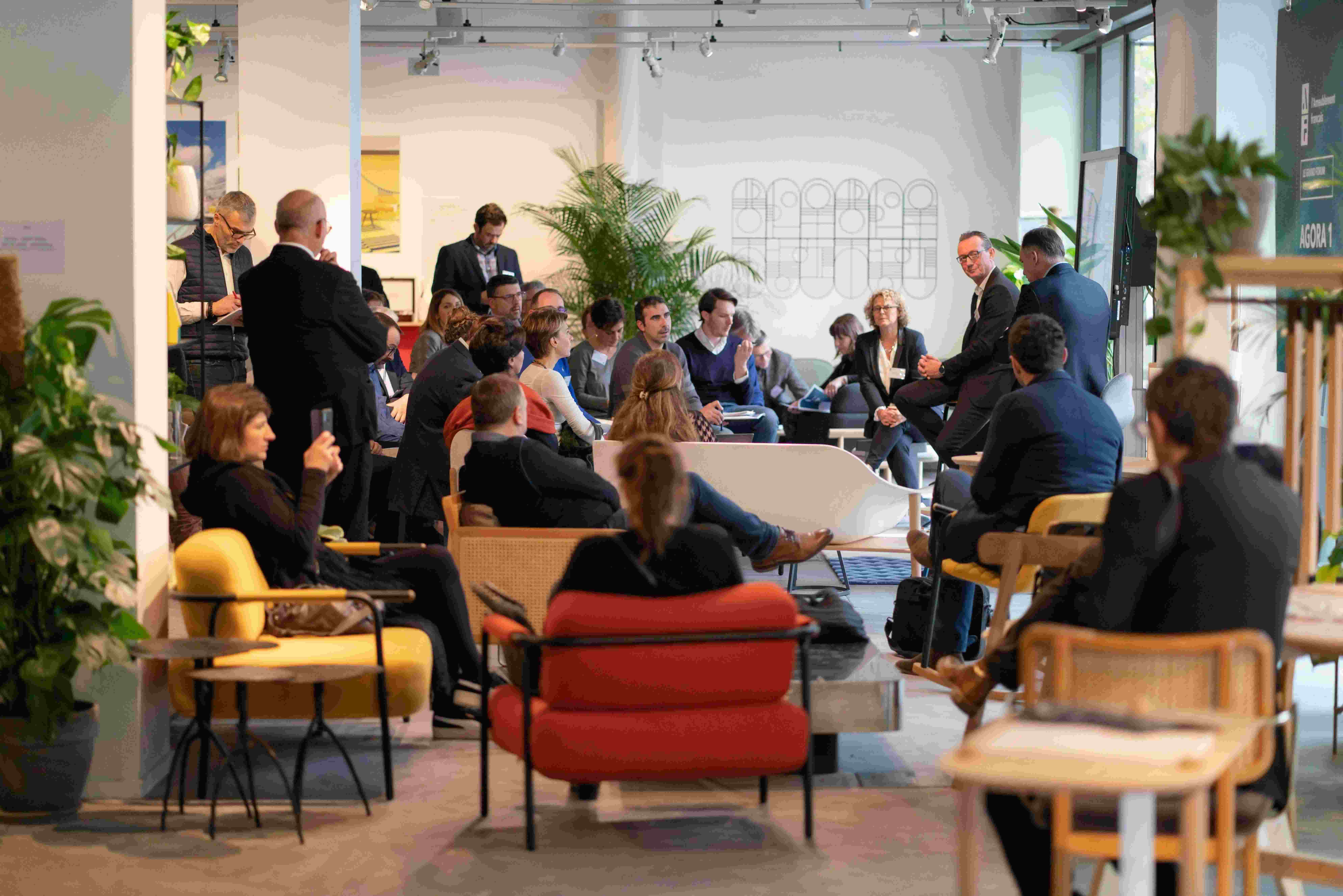 Le mobilier, entièrement sourcé ou fabriqué localement avec nos partenaires artisans, mêle pièces vintage chinées, créations upcyclées et éléments végétaux biophiliques. Chaque zone — espace lounge, scène, espaces de restauration, îlots de networking, comptoirs d'accueil — a été pensée comme un micro-univers cohérent, porteur d'une identité visuelle forte et d'un message clair : le durable c'est désirable.